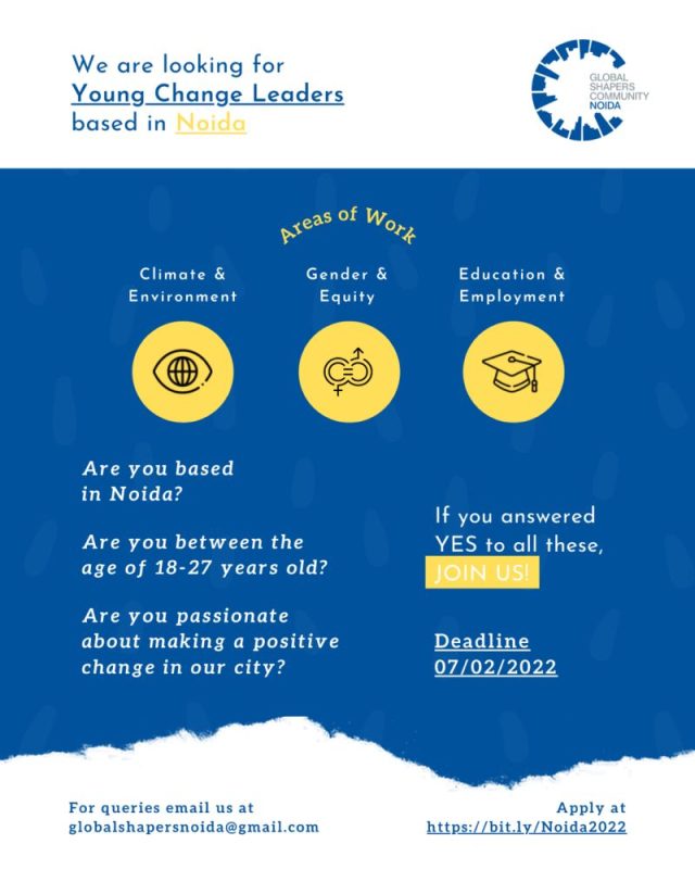 Global Shapers Noida Hub is an Equal Opportunity organization and considers all qualified applicants without regard to race, color, religion, sex, sexual orientation, gender identity, age, marital status, national origin, socio-economic background, protected veteran status, disability, or any other legally protected class.