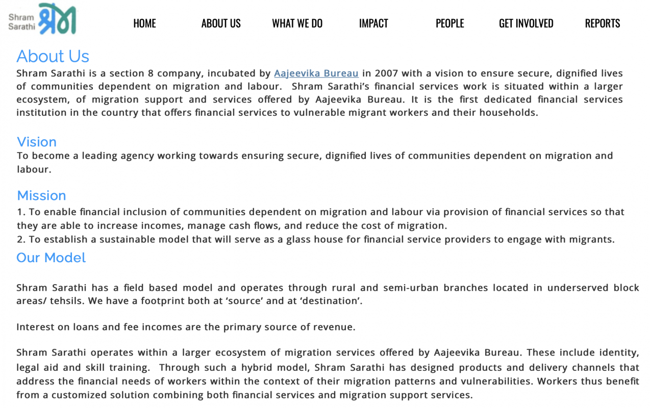 Description: Shram Sarathi is a section 8 company, incubated by Aajeevika Bureau in 2007 with a vision to ensure secure, dignified lives of communities dependent on migration and labour. Shram Sarathi’s financial services work is situated within a larger ecosystem, of migration support and services offered by Aajeevika Bureau. It is the first dedicated financial services institution in the country that offers financial services to vulnerable migrant workers and their households.