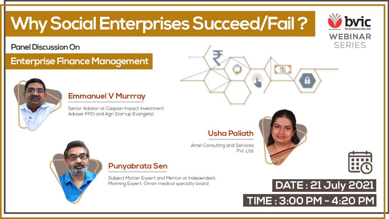 BVIC curated webinar series on *Why Social Enterprises succeed/fail?* The series includes 8 panel discussions on key factors to contribute to the success of Social Enterprises with subject matter experts as panelists. BVIC envisions to strengthen the SE ecosystem through constant engagements and knowledge shared with the stakeholders. The upcoming session is the fourth session, on the topic *Enterprise Finance Management* to discuss the vitality of the same for social enterprises.