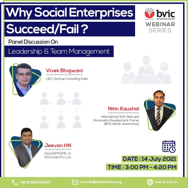 BVIC curated webinar series on Why Social Enterprises succeed/fail? The series includes 8 panel discussions on key factors to contribute to the success of Social Enterprises with subject matter experts as panelists. BVIC envisions to strengthen the SE ecosystem through constant engagements and knowledge shared with the stakeholders. The upcoming session is the third session, on the topic Leadership and Team Management to discuss the vitality of the same for social enterprises.